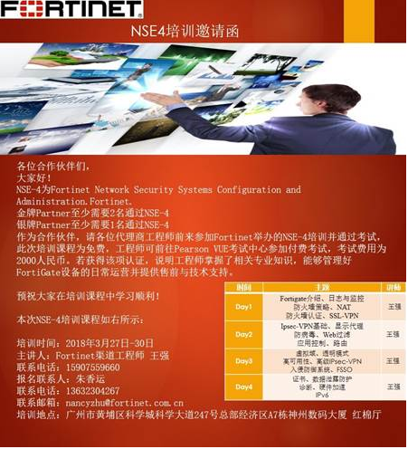 Fortinet 技术工程师NSE4培训邀请函-2018.3.27-30日