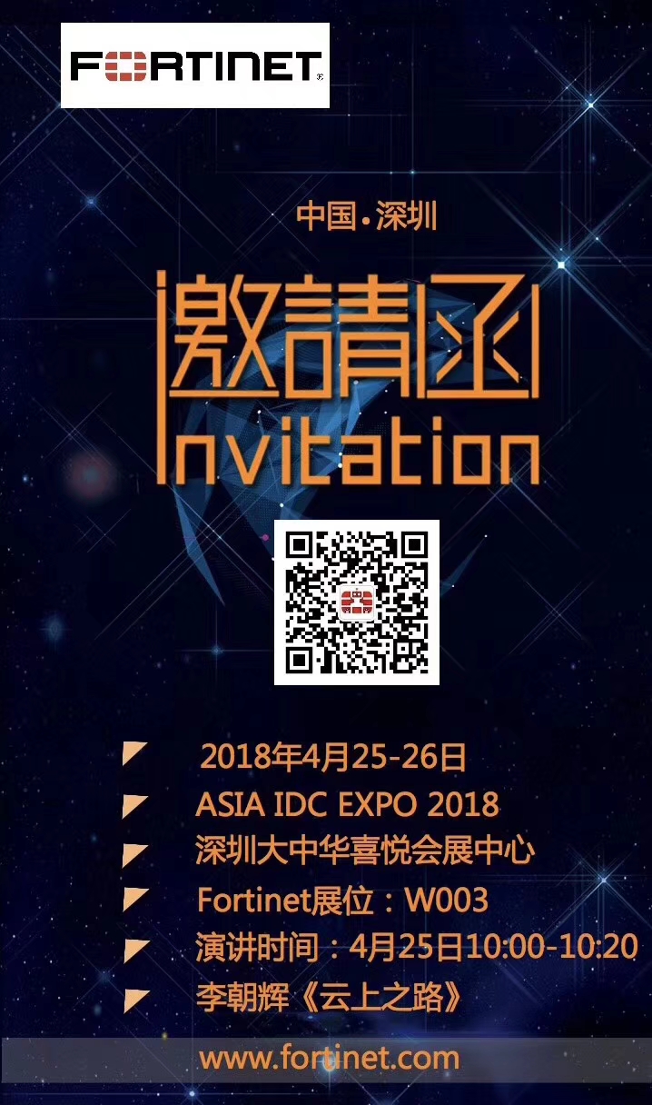 Fortinet 于2018年4月25-26日将在深圳举办一个公开的展览活动,欢迎各位莅临参观!