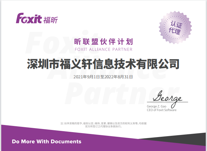 深圳福义轩荣获福昕软件股份授权资质,深圳福义轩公司主要经营从事网络信息化及安全行业多年,福昕软件开发股份有限公司依托深圳福义轩信息在南区深耕多年,资源互补,共同开发广东省新的市场,在2021年度到2022年度一起深度合作。
