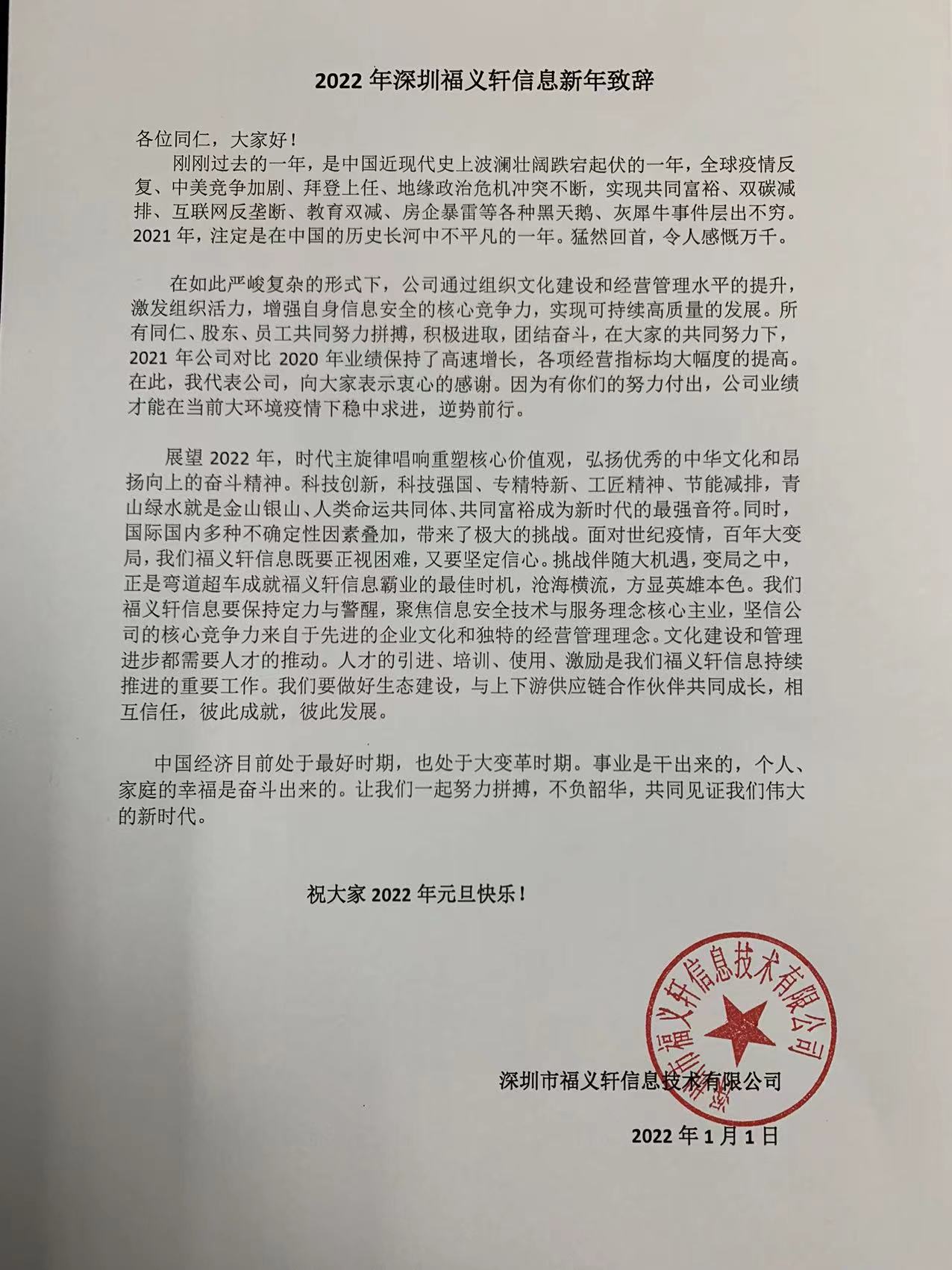 2022年元旦深圳福义轩信息新年致辞