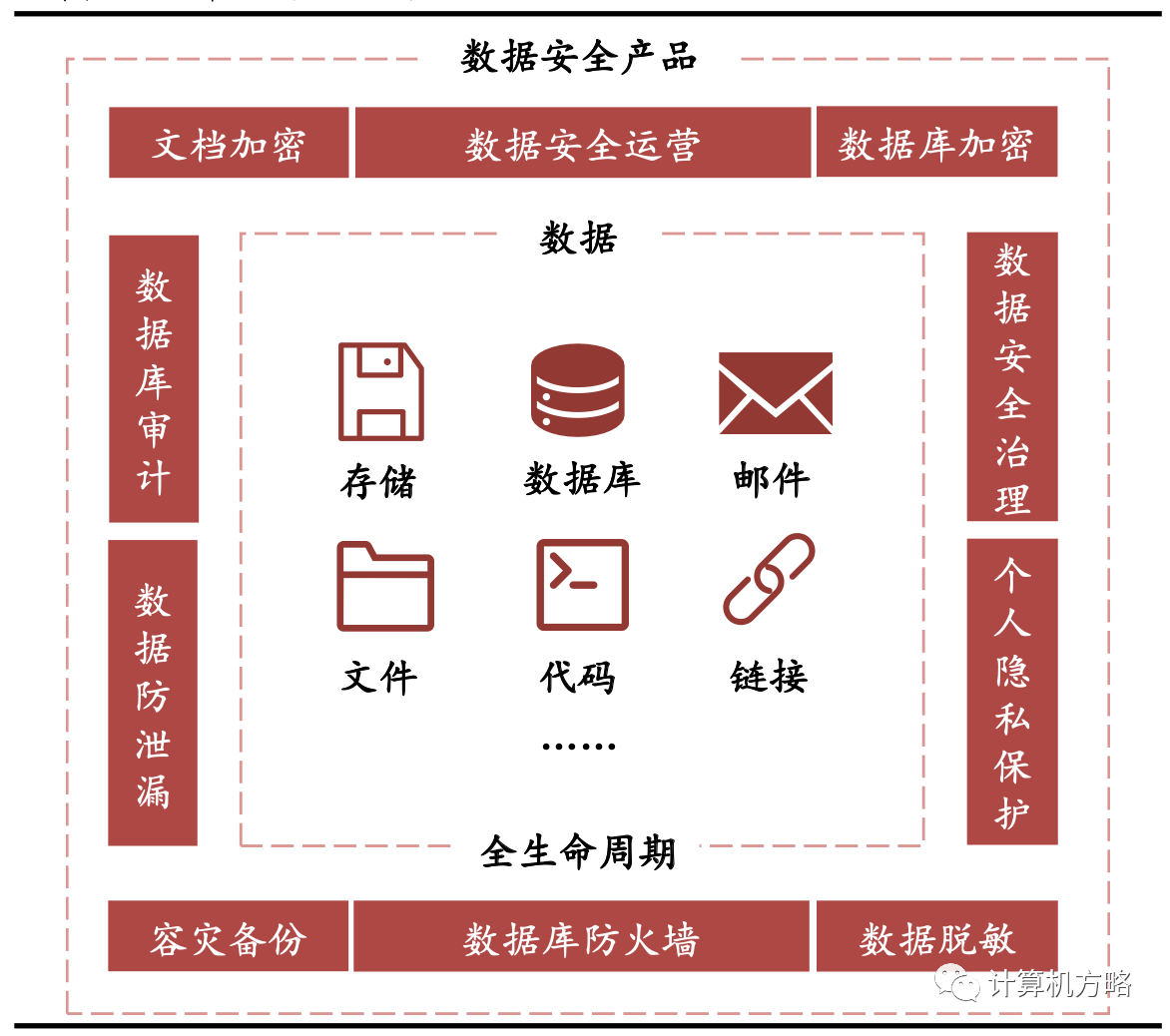 数据安全通常指用于保护计算机系统中数据不因偶然和恶意的原因遭到破坏、更改和泄露的安全工具,以确保数据的可用性、完整性和保密性。数据安全所针对的对象为数据的载体,围绕数据在生成、存储、使用、共享、归档、销毁的整个生命周期安全所衍生出了相关技术和工具,一般包括数据库安全、数据防泄漏、文档加密、容灾备份等等。
