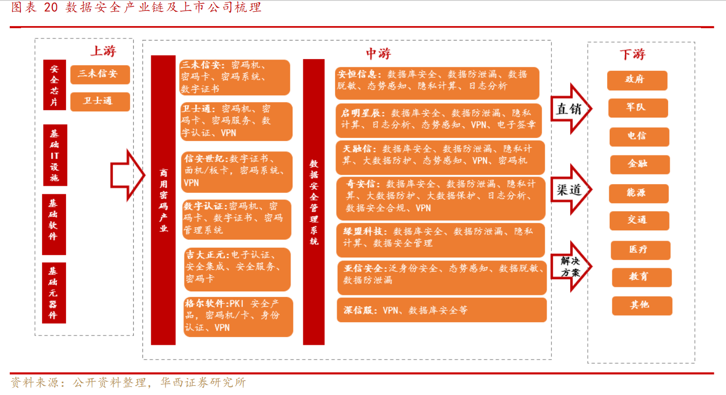 具体来看,数据安全治理领域参与者主要为 数字认证 、 北信源 、 迪普科技 、 任子行 、卫士通、 安恒信息 、 启明星辰 、 深信服 等;数据库安全领域参与者主要为海峡信息、北信源、 格尔软件 、深信服、东进技术、安恒信息、启明星辰、数字认证、数据防泄漏领域参与者主要为北信源、 天融信 、深信服、启明星辰等;个人隐私保护领域参与者主要为炼石网络、 奇安信 等;文档加密领域参与者主要为数字认证、北信源、卫士通;容灾备份领域参与者主要为北信源、深信服、格尔软件。