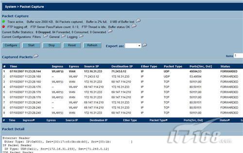 在网络管理和维护方面,SonicWALL还包含了一些非常不错的工具,让网络管理员能更深入的了解问题发生的原因。在SoincWALL防火墙的系统菜单中你可以发现一个数据包抓包工具,它可以根据IP、协议、端口和TZ 190的物理接口来捕获所有数据包。