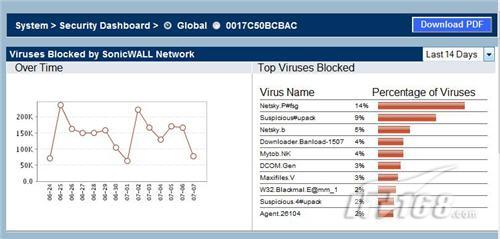 当你首次登录到TZ 190中时,通过一个安全统计表,你可以看到SonicWALL的全球安全表现,其中包括过去两周内,SonicWALL设备所阻挡的病毒、入侵行为、恶意软件和数据攻击的数量等。