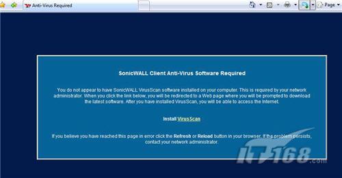 在客户端,TZ 190可以通过配置来强制网络中的所有计算机必须安装SonicWALL反病毒软件,否则它们会被禁止访问互联网,并被提示下载安装合适的反病毒软件客户端,如下图所示。