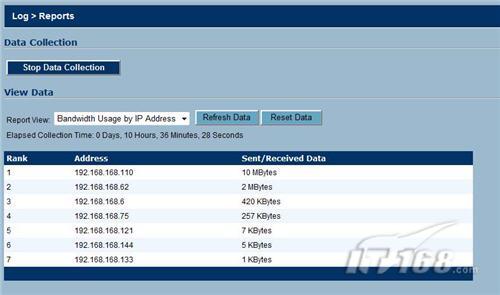 除此之外,TZ 190还可以提供该路由器防火墙的详细数据报告,例如某个IP的带宽使用情况(如下图),某个服务的带宽使用情况,后者对在网络上有效管理QoS非常有帮助。
