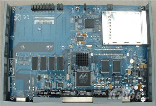 它的电路板非常“干净”,如下图所示。右上角的比较大的银色部分是WWAN卡所使用的PCMCIA插槽。它使用了由Cavium生产的芯片,采用的是Cavium的Nitrox安全处理器系列。另外它使用了被动冷却技术,因此没有任何噪音,具有128MB的内存和16MB的闪存。
