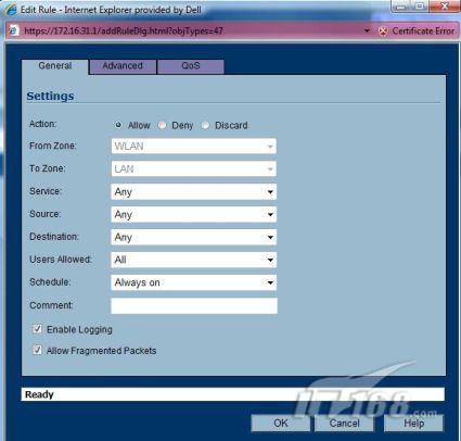 域(Zones)和地址对象(Address Objects)这两个概念对理解SonicWALL安全性也是非常关键的。我们可以通过域来控制接口之间的通信。接口可以被分组到域中。举个例子来说,默认域配置阻挡无线局域网客户端访问有线网络内的客户端机器或设备,要想改变它,可以通过把默认防火墙访问规则中的WLAN域到LAN域的通信从拒绝(Deny)修改为允许(Allow)。如下图所示。